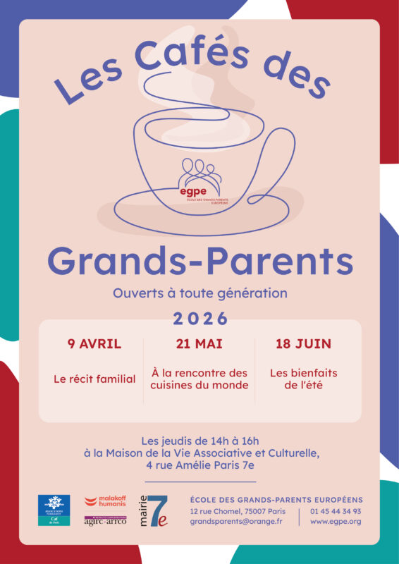 Grands-parents, rencontrons nous et discutons autour d’un café animé par l’École des Grands-Parents Européens à la Maison des associations du 7e arrondissement au 4, rue Amélie.